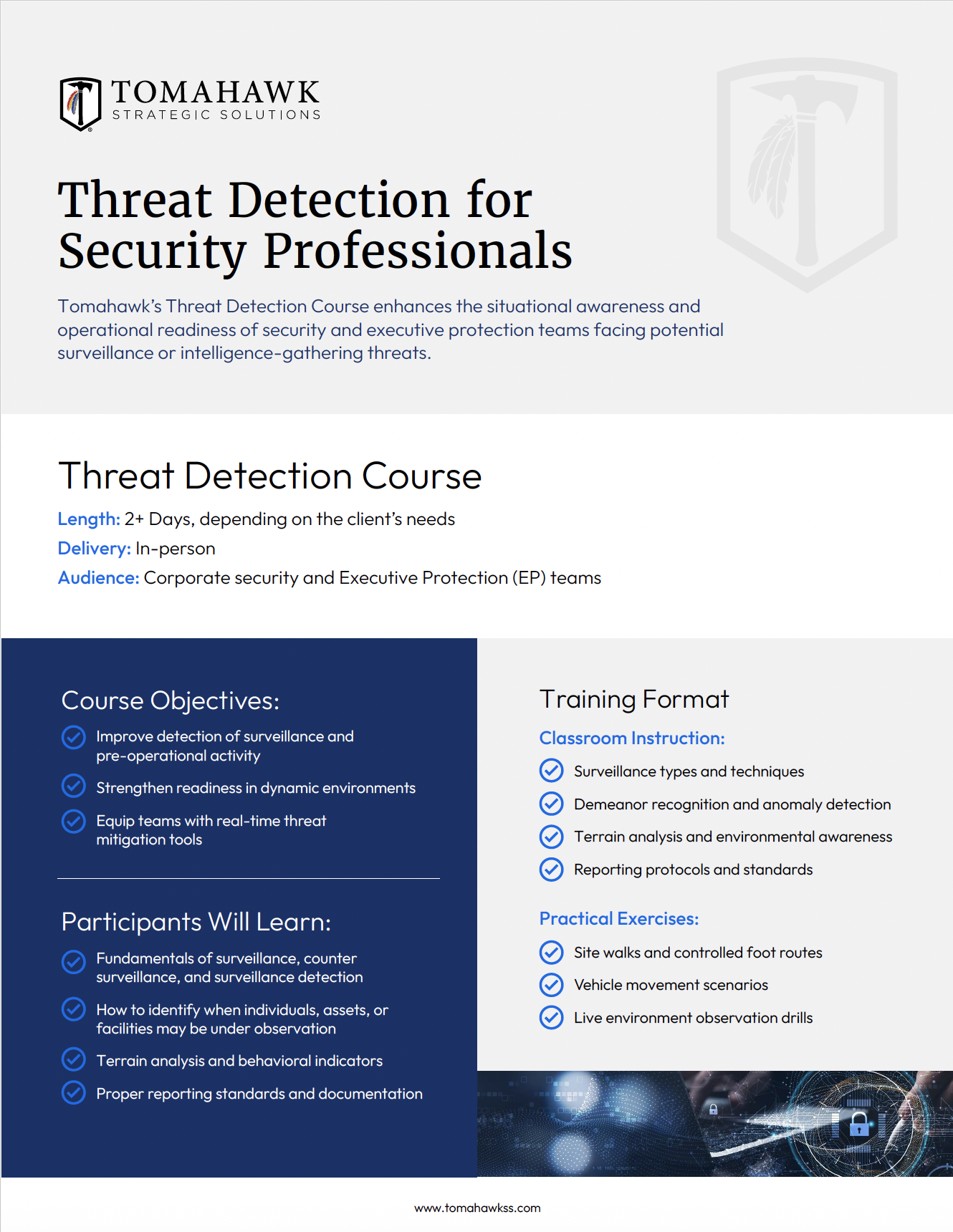 Tomahawk’s Threat Detection Course is designed for security professionals and executive protection teams facing potential surveillance or intelligence-gathering threats. The course will enhance their situational awareness and operational readiness when it comes to observing real-world threats, addressing them, and securing your safety in the future.