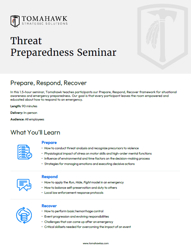 In this 1-hour seminar, Tomahawk teaches participants our Prepare, Respond, Recover framework for situational awareness and emergency preparedness. Our goal is that every participant leaves the room empowered and educated about how to respond to an emergency.